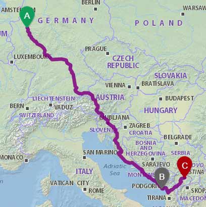 Der Bus für die Strecke Kassel-Prishtina fährt durch diese Ländern: Deutschland, Österreich, Slovenien, Kroatien, Montenegro, Albanien und Endziel ist Kosova.